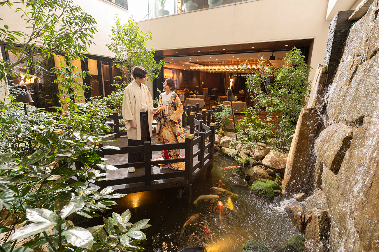 館の中央に位置する中庭は、豊かな緑と美しい水面が広がる開放的な空間。隣接した披露宴会場では自由に行き来することもでき、ゲスト様にも楽しいひとときをお楽しみいただけます。日常の喧騒をわすれさせ、特別な日をより華やかに彩ります。
