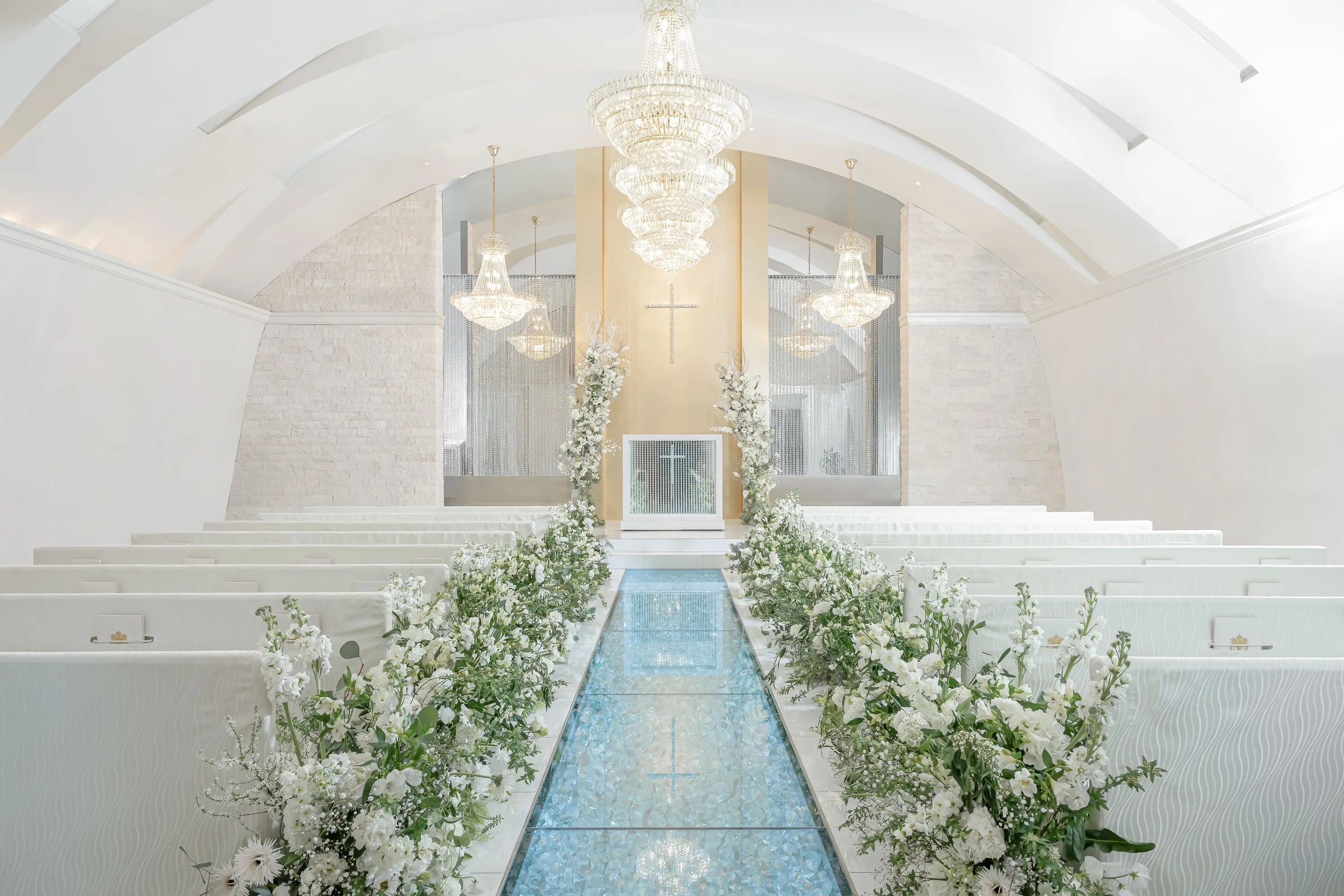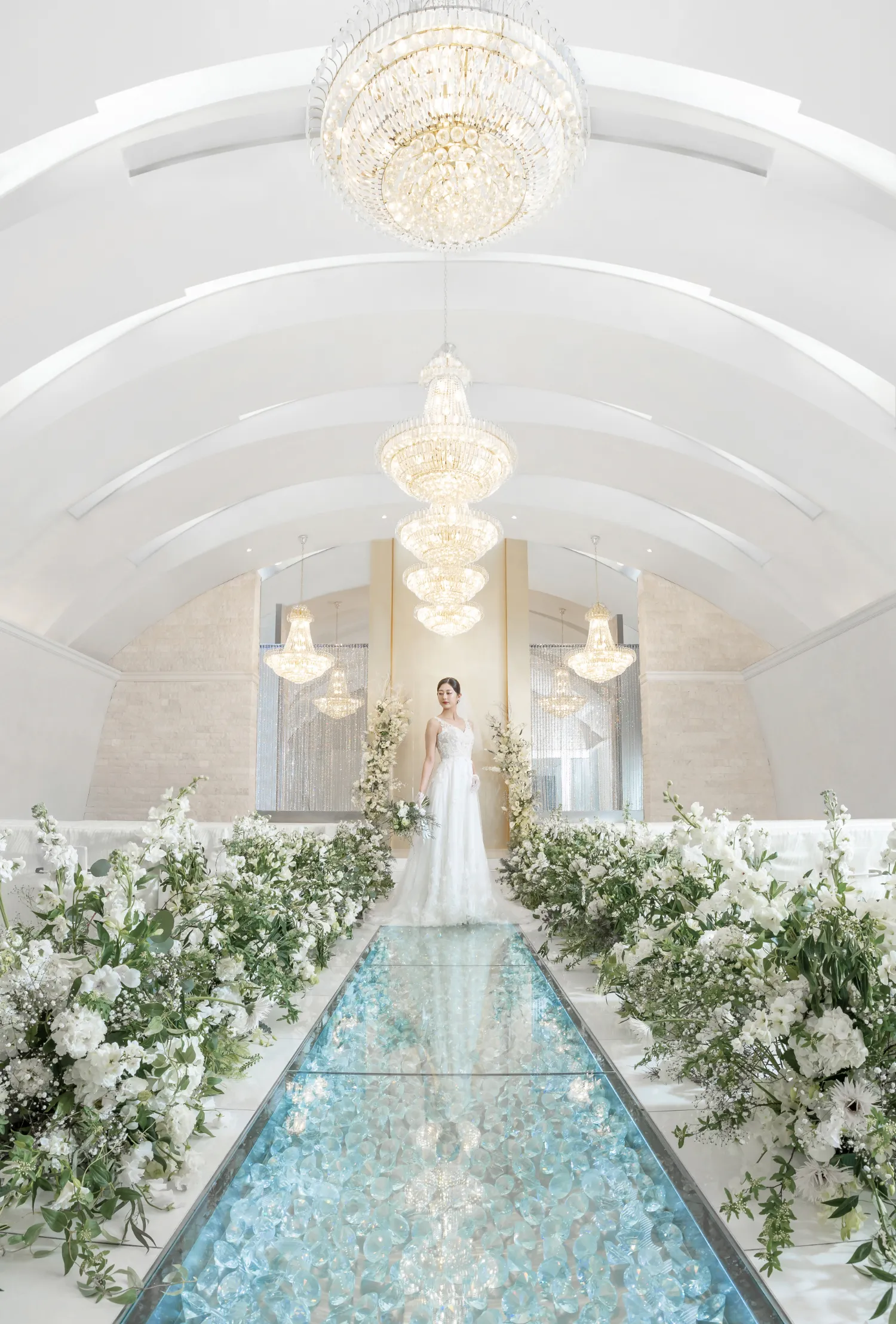 シャンデリアの輝きとクリスタルの煌めきが美しいガラスのバージンロードが、