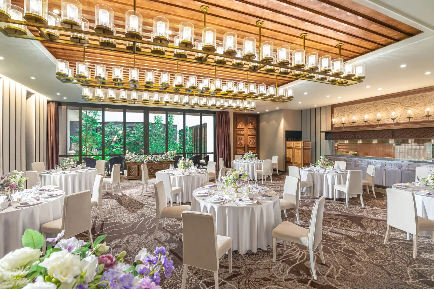 披露宴会場は洗練されたモダンデザインと木の質感が織りなす上質な空間。